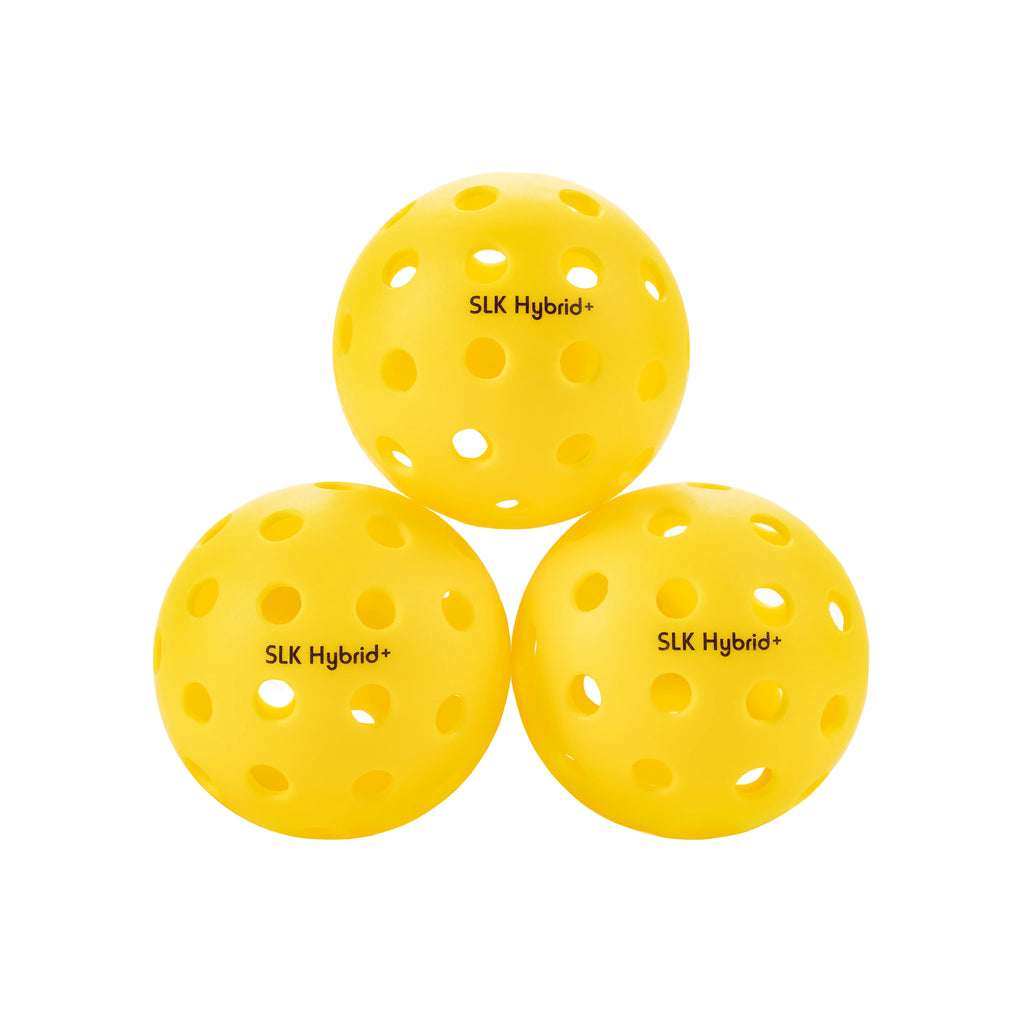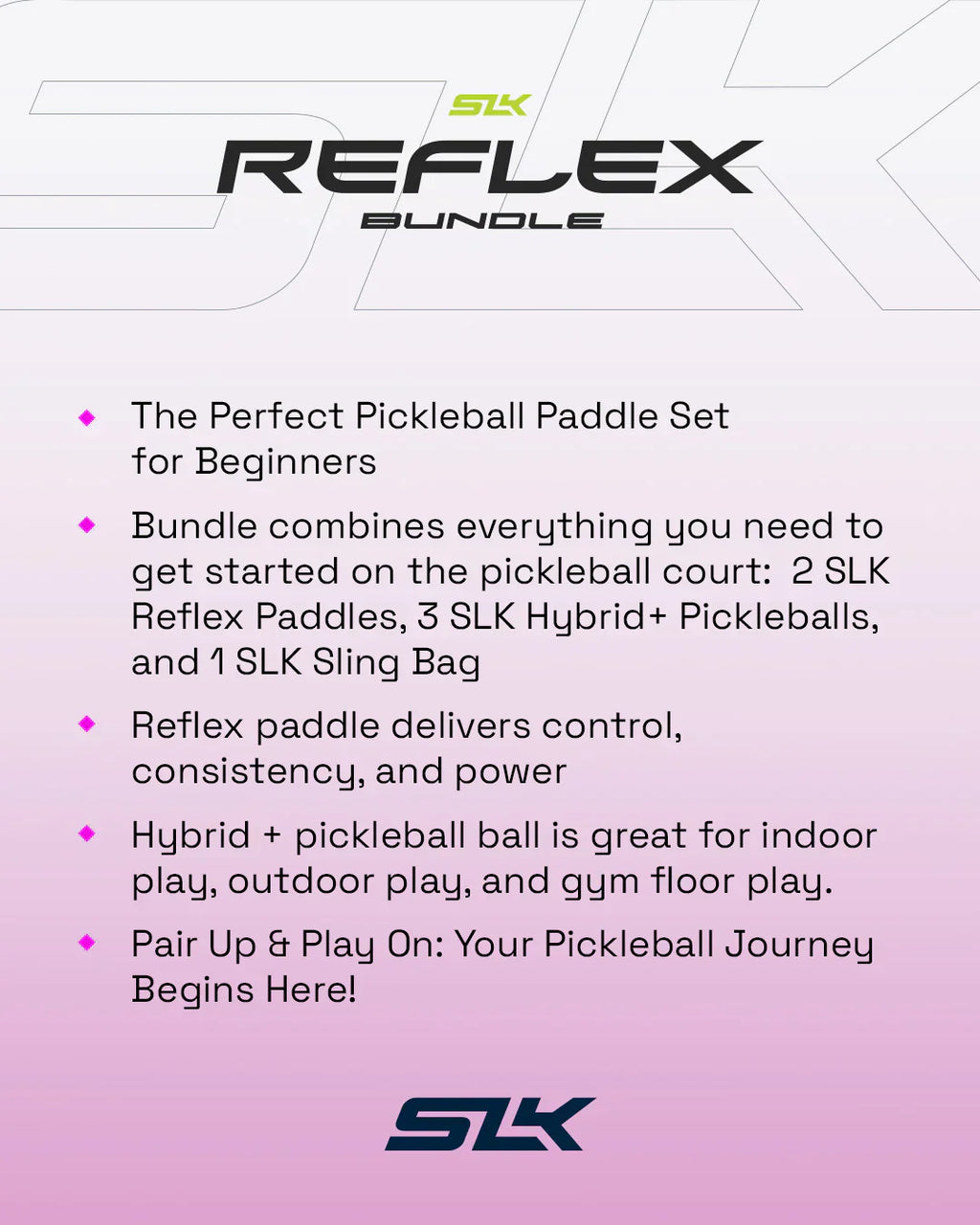 This bundle also includes three SLK Hybrid+ pickleballs for versatile indoor and outdoor play, and a durable SLK sling bag for easy transportation of all your gear.